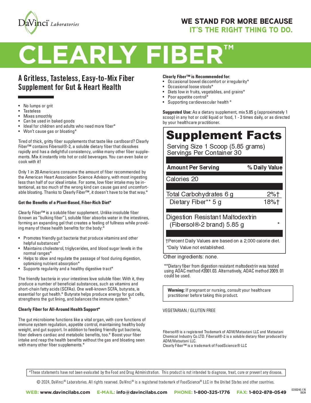 Clearly Fiber Prebiotic Fiber is a dietary supplement that supports bowel regularity, fecal volume and increased bifidobacteria in intestinal microflora.* Clearly Fiber™ is a good source of fiber that represents a unique supplement option: it is tasteless, gritless, stable at high temperatures (good for baking), and it dissolves completely in any beverage or soft food. Clearly Fiber™ is a sugar free, low calorie fiber product from digestion-resistant maltodextrin.