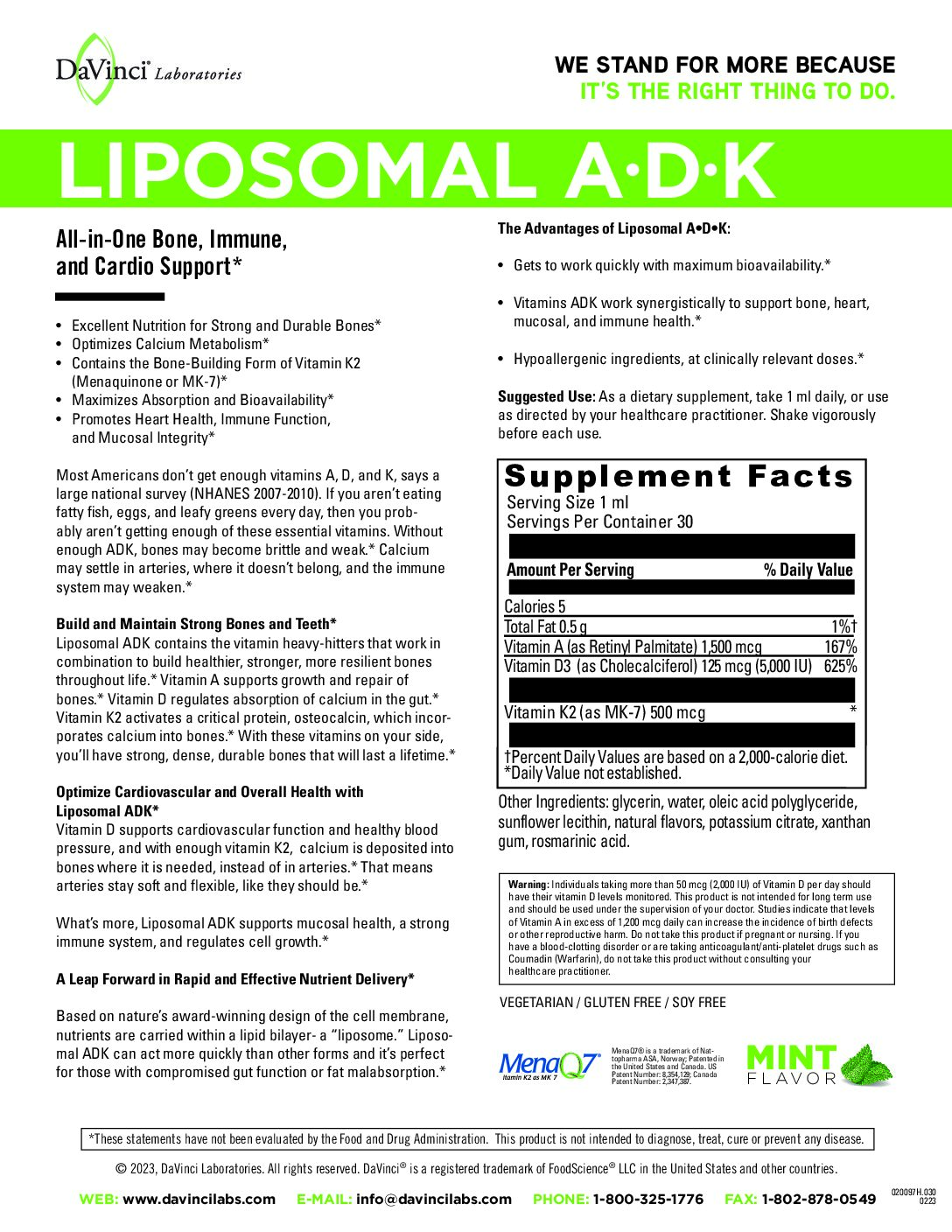 Liposomal A.D.K. contains the vitamin heavy-hitters that work in combination to build healthier, stronger, more resilient bones throughout life.* Vitamin A supports growth and repair of bones.* Vitamin D regulates absorption of calcium in the gut.* Vitamin K2 activates a critical protein, osteocalcin, which incorporates calcium into bones.* With these vitamins on your side, you’ll have strong, dense, durable bones that will last a lifetime.*
