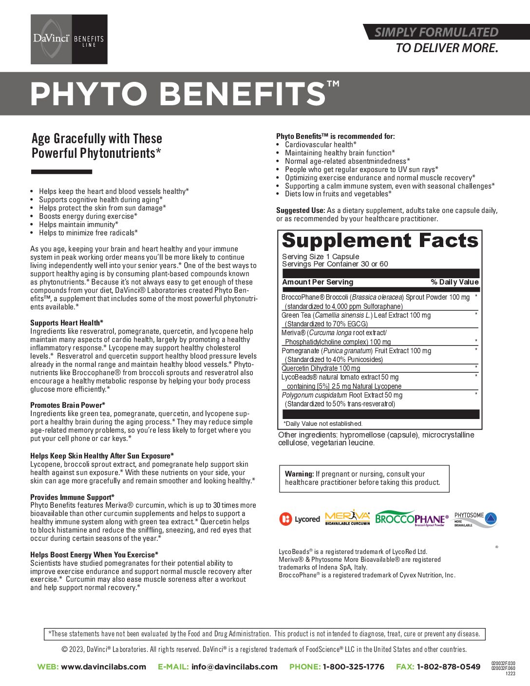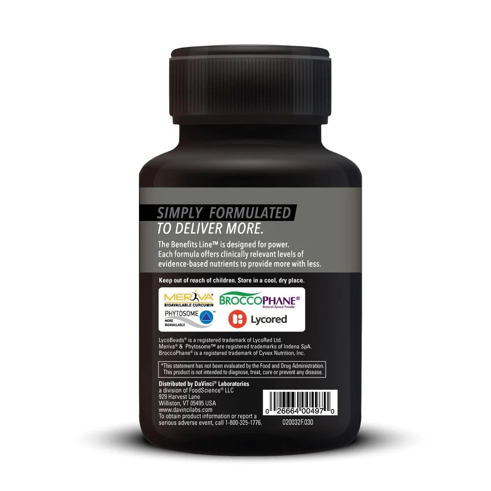 Phyto Benefits’ unique formula, part of DaVinci’s® Benefits Line, provides evidence-based extracts from the most powerful botanicals in natural medicine.* This compilation formulation covers the concerns associated with supporting healthy levels of oxidative stress, detoxification capabilities, metabolic processes and immune health.* In a health regimen for your patients, Phyto Benefits™ can easily be used as an oxidative stress botanical multi option. It also can be used as a companion product to a standard multivitamin or to any aging protocol, such as one that includes Telomere Benefits™.