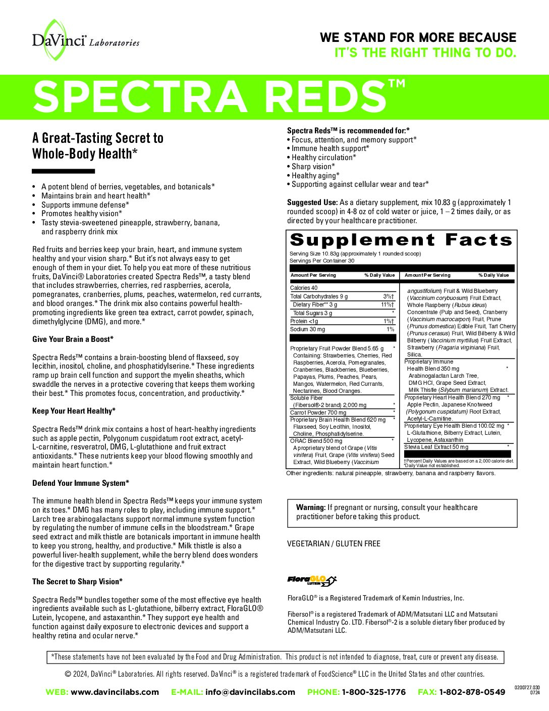 Spectra Reds is a powerful blend of nutrients specifically designed to support your body’s defense system.* Spectra Reds™ contains nutrient rich berries, fruits and potent plant extracts in combination with DMG HCl, acetyl L carnitine, phosphatidylserine, resveratrol, lycopene and lutein. It helps to support optimal liver, immune, neurological, cardiovascular and eye functions.* This delicious fruity powder is a convenient way to boost your energy and support the body in attaining optimal health.* Each serving contains a minimum of 5000 ORAC units and 3 grams of fiber for digestive tract support.*