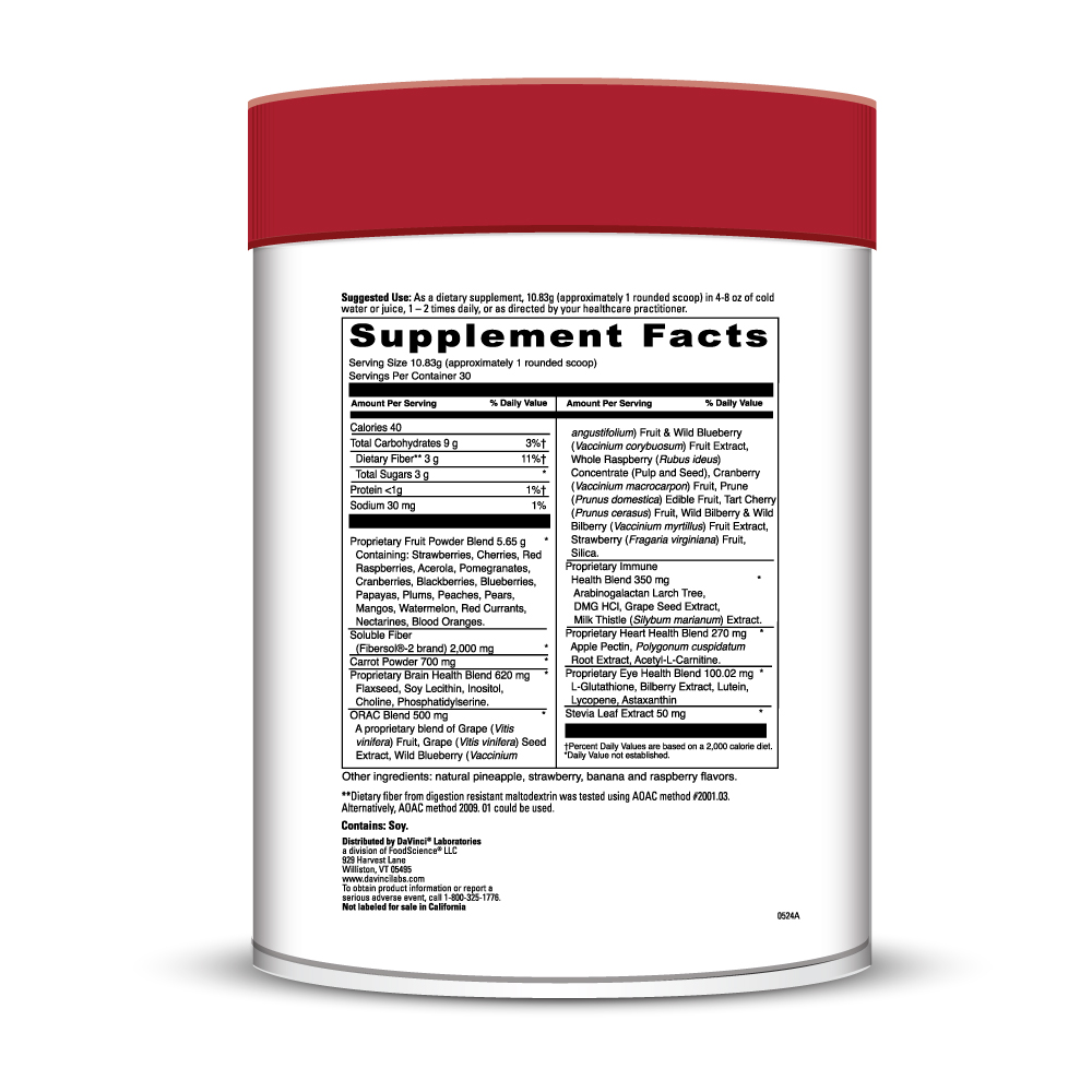 A proprietary blend of Grape (Vitis vinifera) Fruit, Grape (Vitis vinifera) Seed Extract, Wild Blueberry (Vaccinium angustifolium) Fruit & Wild Blueberry (Vaccinium corybuosum) Fruit Extract, Whole Raspberry (Rubus ideus) Concentrate (Pulp and Seed), Cranberry (Vaccinium macrocarpon) Fruit, Prune (Prunus domestica) Edible Fruit, Tart Cherry (Prunus cerasus) Fruit, Wild Bilberry & Wild Bilberry (Vaccinium myrtillus) Fruit Extract, Strawberry (Fragaria virginiana) Fruit, Silica.