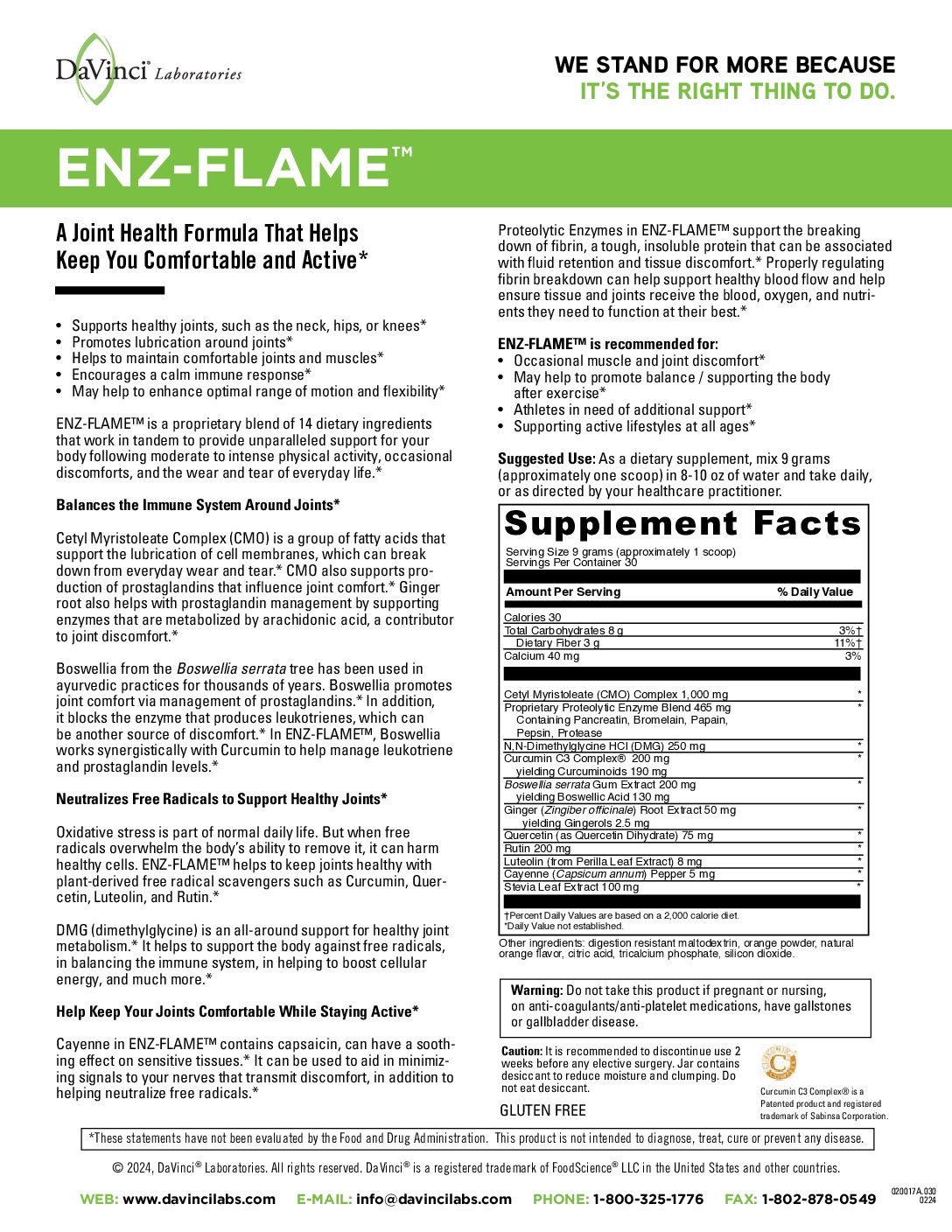 ENZ-FLAME™ is recommended for: • Occasional muscle and joint discomfort* • May help to promote balance / supporting the body after exercise* • Athletes in need of additional support* • Supporting active lifestyles at all ages* Suggested Use: As a dietary supplement, mix 9 grams (approximately one scoop) in 8-10 oz of water and take daily, or as directed by your healthcare practitioner.