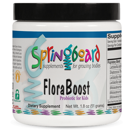 FloraBoost is a probiotic formula for children, designed to deliver live bacteria that promote healthy gut microflora, protect intestinal integrity and boost immune function. The formula contains three strains of Lactobacilli and three strains of Bifidobacteria, as well as Streptococcus thermophilus and Saccharomyces boulardii, an extensively researched microorganism shown to help restore microflora balance by enhancing commensal organism function. The eight strains in FloraBoost have been strategically selected based on research supporting their survivability and adherence to the intestinal tract. FloraBoost comes in a powder form for easy administration to children.