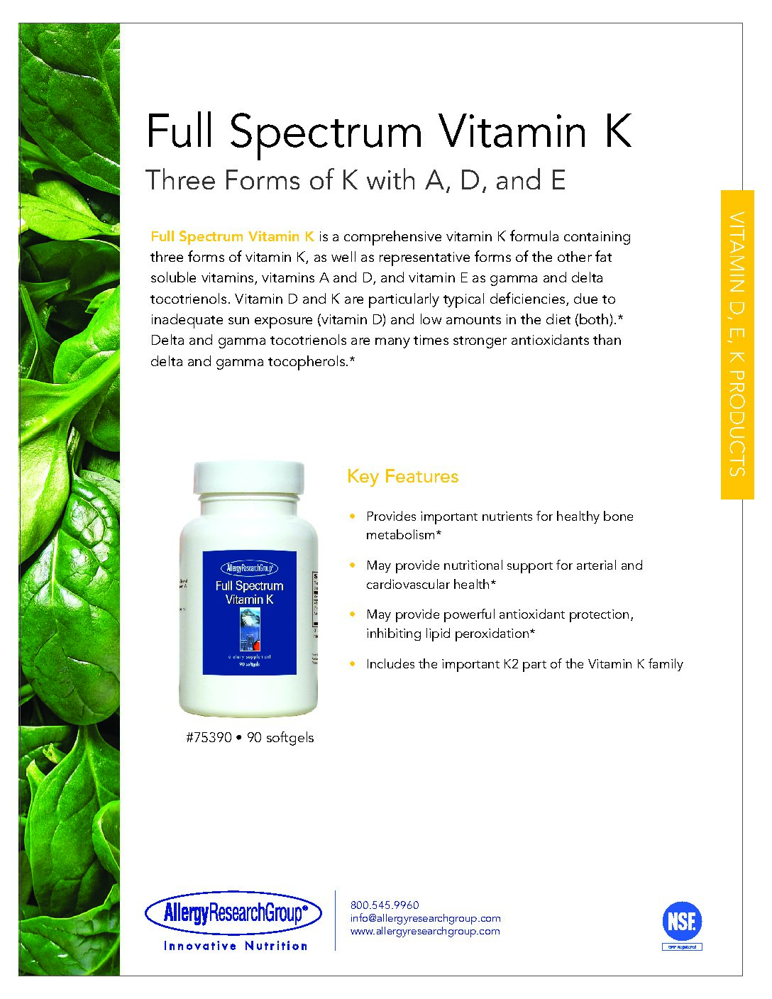 Full Spectrum Vitamin K is a comprehensive vitamin K formula containing vitamins K1 and K2, as well as representative forms of the other fat-soluble vitamins, vitamins A and D, and vitamin E as gamma and delta tocotrienols. Vitamin D and K may be deficient due to inadequate sun exposure (vitamin D) and low amounts in the diet (both).* Delta and gamma tocotrienols are reported to have stronger antioxidant activity than delta and gamma tocopherols.