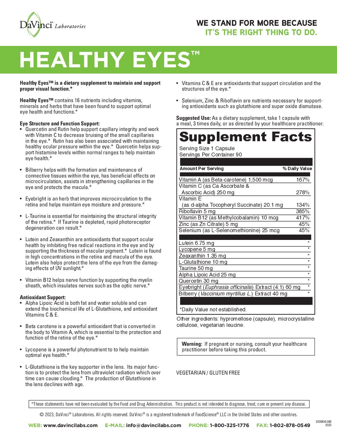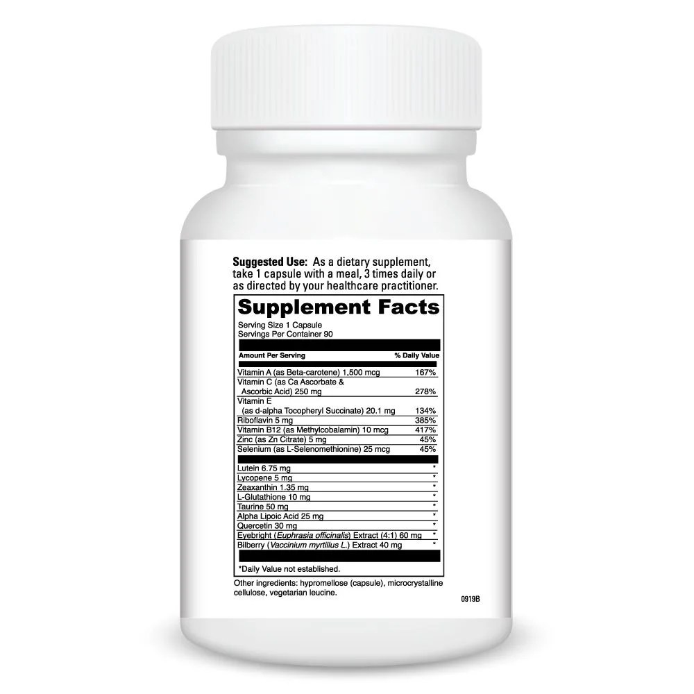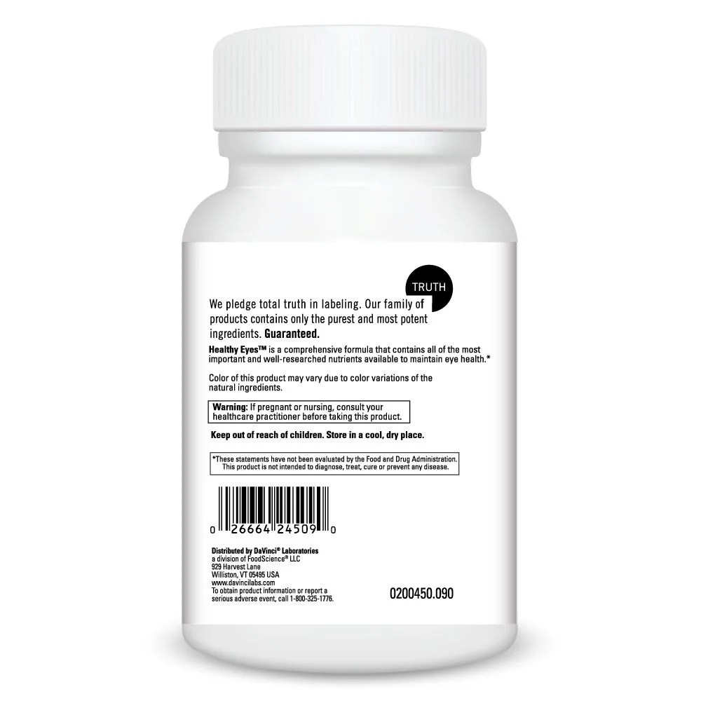 Healthy Eyesâ„¢ is an advanced nutritional supplement designed to maintain ocular health that may decline as a result of dietary inadequacies, aging, toxins, free radical exposure, stress, and sunlight.* The formula includes the free radical fighters Alpha Lipoic Acid and Beta Carotene; Bilberry Extract, which contains bioflavonoids that support healthy histamine levels and helps remove materials from the retina; Eyebright, an herb that is used extensively for dry, irritated eyes, and eye strain; L-Glutathione and Lutein to help protect the lens from UV rays; Taurine, essential for maintaining the structural integrity of the retina; Quercetin and Rutin to support capillary strength; and Lycopene, a phytonutrient from tomatoes with free radical fighting properties.*