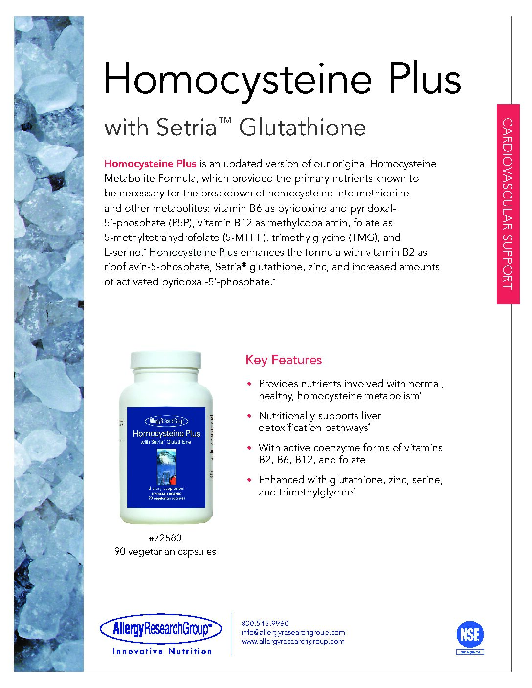 Homocysteine Plus is an updated version of our original Homocysteine Metabolite Formula. It provides the primary nutrients known to be necessary for the breakdown of homocysteine into methionine and other metabolites, including vitamin B6 as pyridoxine and pyridoxal-5’-phosphate (P5P), vitamin B12 as methylcobalamin, folate as 5-methyltetrahydrofolate (5-MTHF), trimethylglycine (TMG), and L-serine.* It is now enhanced with vitamin B2 as riboflavin-5-phosphate, Setria® glutathione, zinc, and increased amounts of activated pyridoxal-5’-phosphate.*