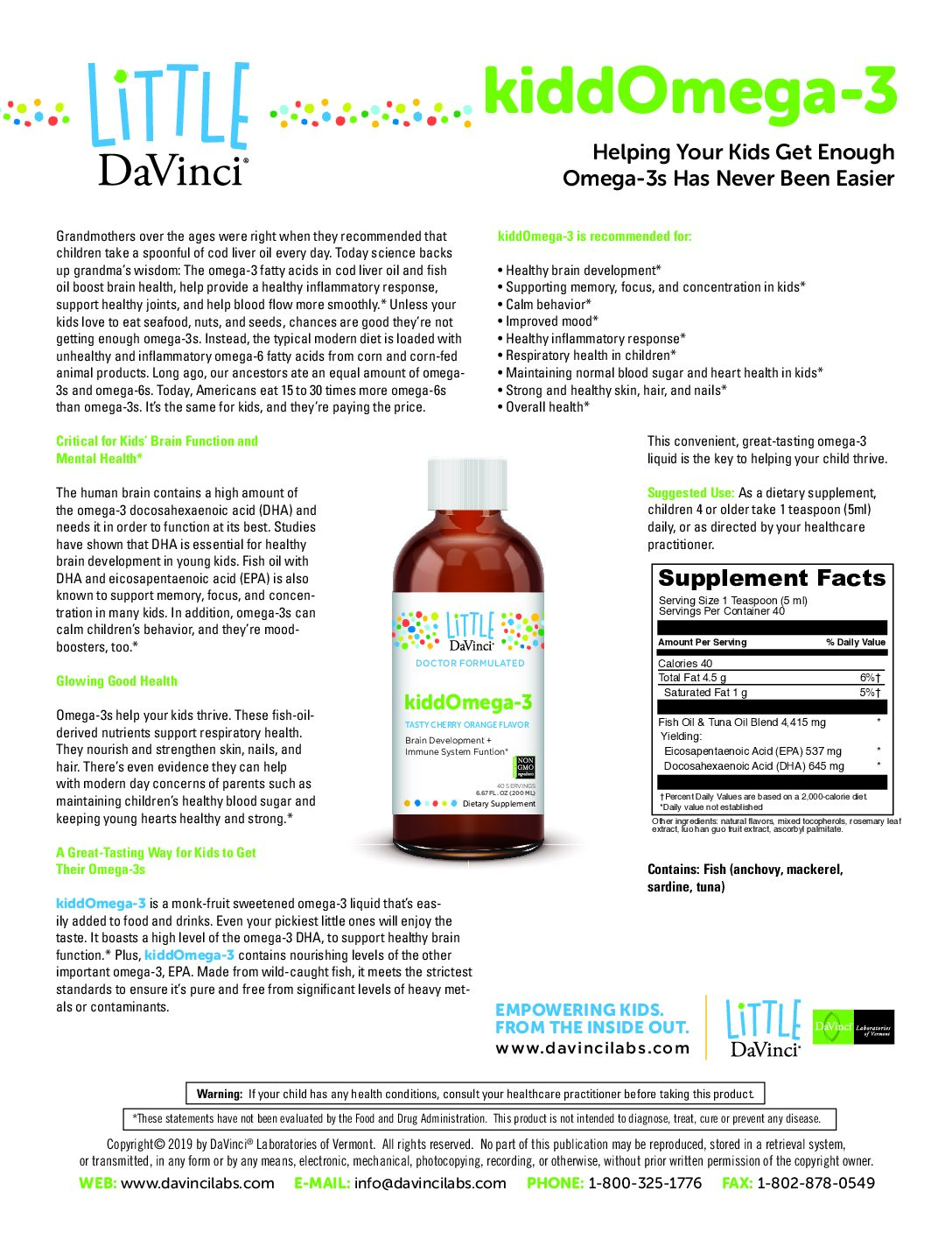 kiddOmega-3 is a monk-fruit sweetened omega-3 liquid that’s easily added to food and drinks. Even your pickiest little ones will enjoy the taste. It boasts a high level of the omega-3 DHA, to support healthy brain function and also contains nourishing levels of the another important omega-3, EPA.* Made from wild-caught fish, it meets the strictest standards to ensure its purity.