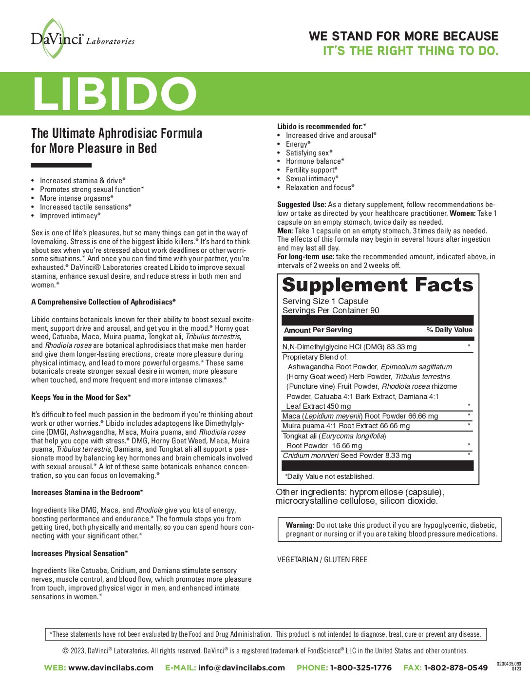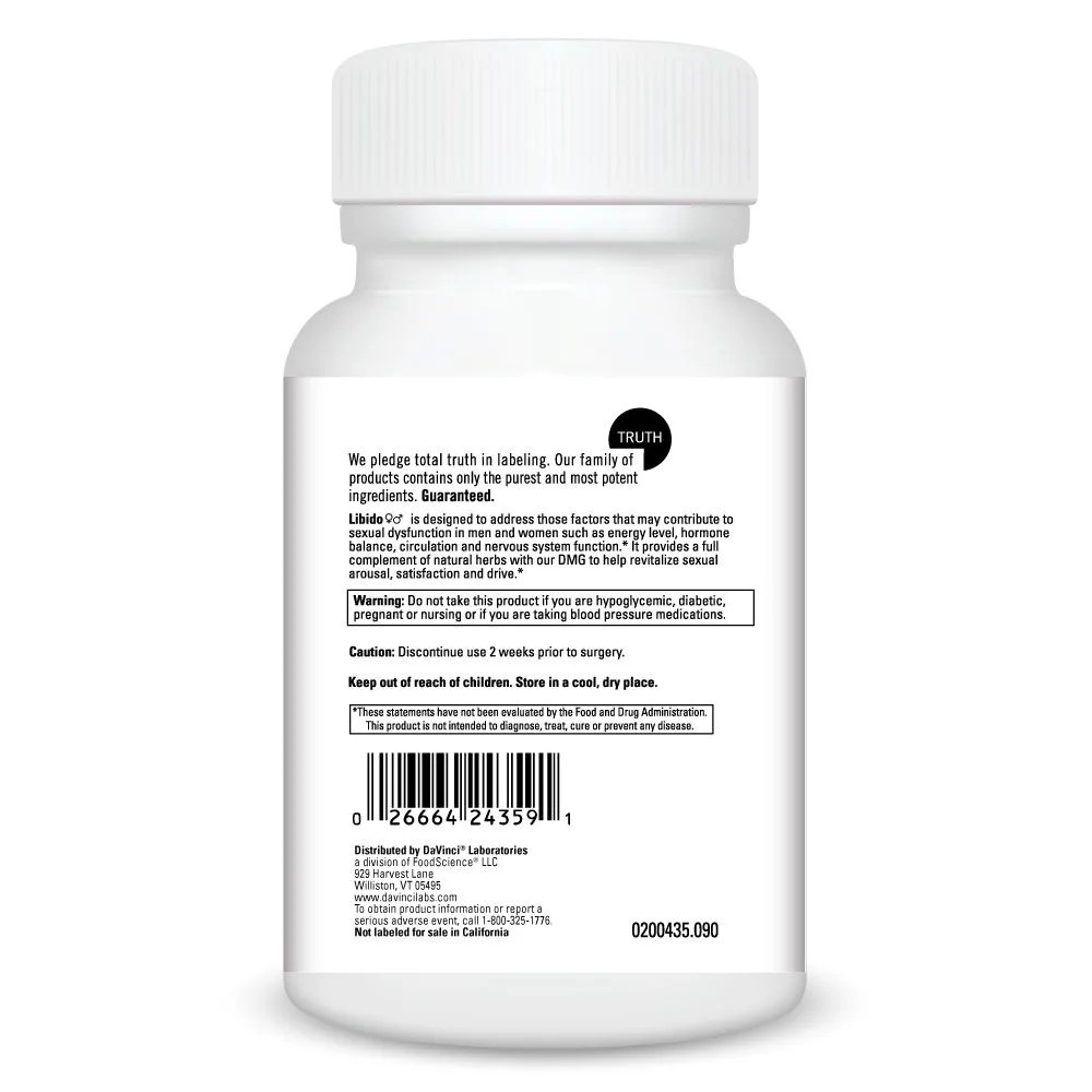 A dietary supplement for men and women to support healthy sexual drive, pleasure and function.* Libido is designed to address those factors that may contribute to sexual dysfunction in men and women such as energy level, hormone balance, circulation, and nervous system function.* It provides our patented DMG to help revitalize sexual arousal, satisfaction and drive.*