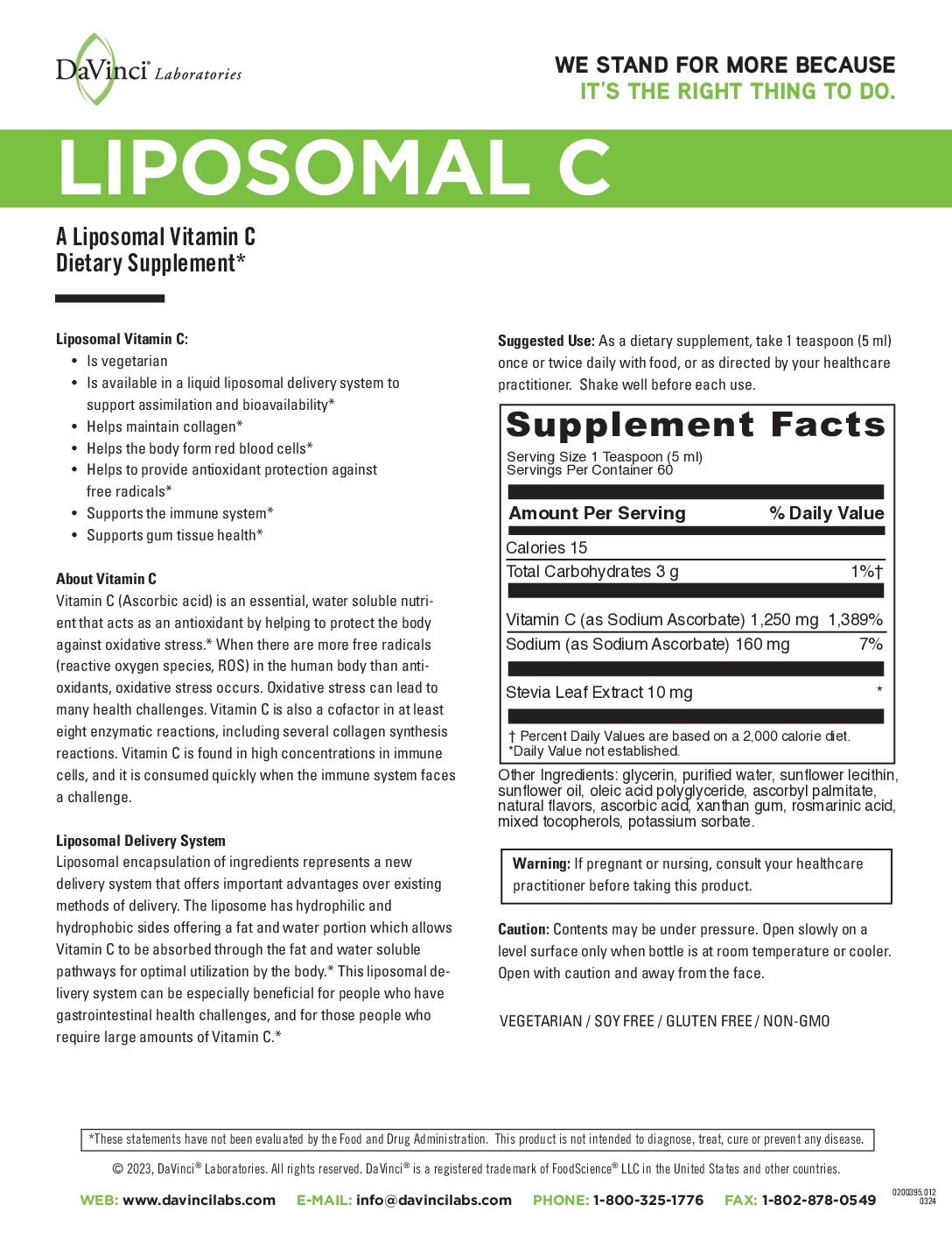 Liposomal C is a liquid supplement that provides a powerful dose of vitamin C in a liposomal delivery system that offers optimal assimilation.* The liposome has hydrophilic and hydrophobic sides, providing a fat and water portion, which allows vitamin C to be absorbed through the fat and water soluble pathways for proper utilization in the body. It is especially beneficial for patients with general GI dysfunction.* Each serving provides 1250 mg of vitamin C in a flavorful, vegetarian, and citrus-free liquid.