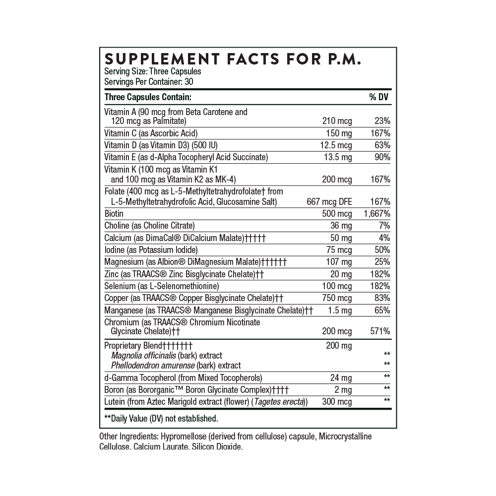 Take 3 capsules of the A.M. formula in the morning and 3 capsules of the P.M. formula in the evening daily with a meal or as recommended by your health-care practitioner.