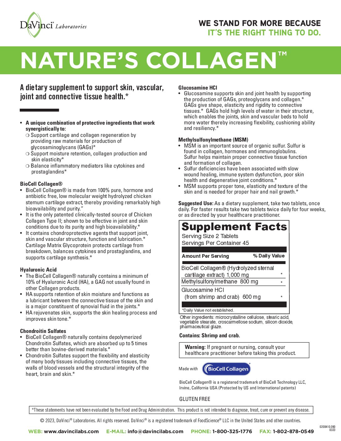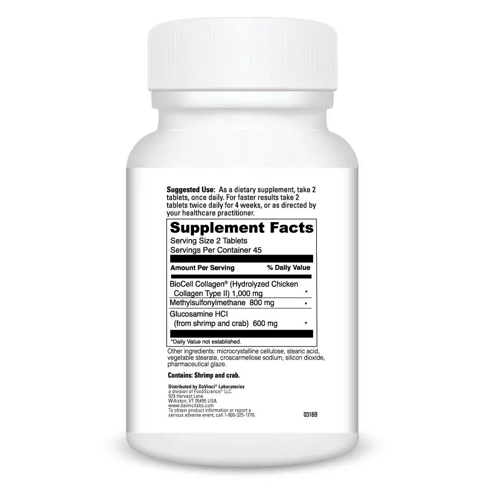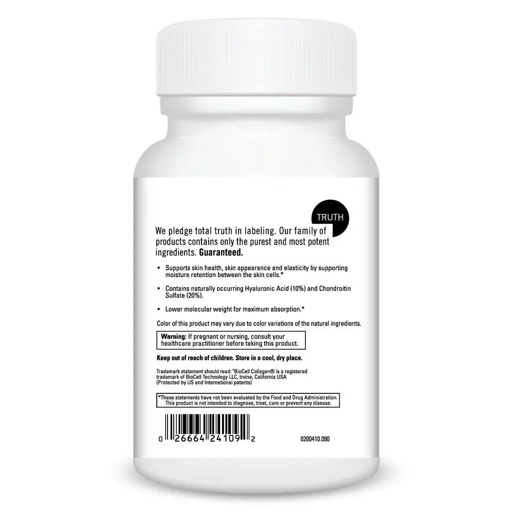 Nature’s Collagen is a dietary supplement to support skin, joint, and connective tissue health.* Natures Collagenâ„¢ contains BioCell Collagen® which is a multi-functional, patented ingredient for joint, skin, and vascular support.* BioCell Collagen® is made from 100% pure enzymatically hydrolyzed chicken sternum cartilage, thereby providing high bioavailability and purity. BioCell Collagen® naturally contains a minimum of 20% depolymerized Chondroitin Sulfate, a form of Chondroitin Sulfate that is absorbed up to 5 times better than bovinederived materials.* BioCell Collagen® is naturally rich in Hyaluronic Acid (10%) and Cartilage Matrix Glycoprotein (CMGP), powerful substances that support cartilage health and function as well as joint comfort.* The benefits of Natures Collagenâ„¢ with Glucosamine HCI, and Methylsulfonylmethane make this a unique, advanced, and effective formula for skin and connective tissue health.*