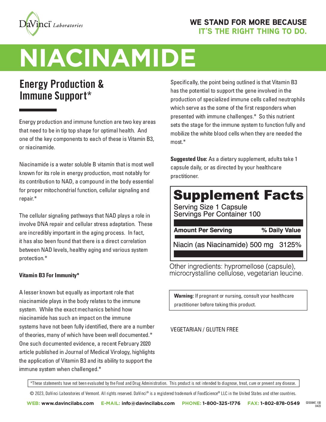 Niacinamide is a form of Vitamin B3 that does not produce flushing (feeling hot) when taken in recommended amounts.