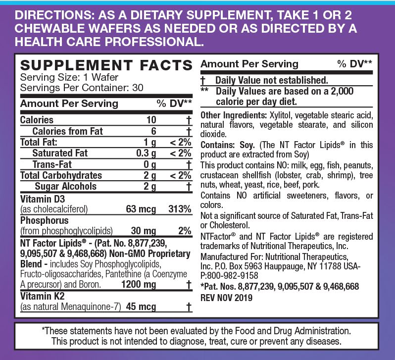 NT Factor with D3 and K2 is a chewable, pleasant vanilla wafer that helps restore your energy*, reduces fatigue*, and gives the additional benefit of vitamin D3 and K2 supplementation in one tasty wafer. Research proves that NT Factor Lipids® repair and restore the body’s cells to a state more resembling a younger person’s. That equals energy—Natural Energy!