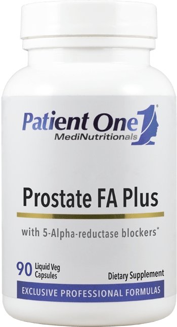 Patient One Prostate FA Plus supplies evidence-backed fatty acids, phytosterols and carotenoid antioxidants in a liquid-filled gelatin capsule, formulated to promote prostate health and urinary function. Prostate FA Plus features multiple natural compounds shown to support healthy 5-alpha-reductase enzyme activity. In addition, the formula helps promote normal cell growth and inflammatory balance, helping to ease prostate-related urinary nocturia and residual dribbling while encouraging healthy, comfortable urinary flow. Prostate FA Plus is an ideal all-in one formula for supporting prostate and urinary health, promoting peak quality of life for your male patients.