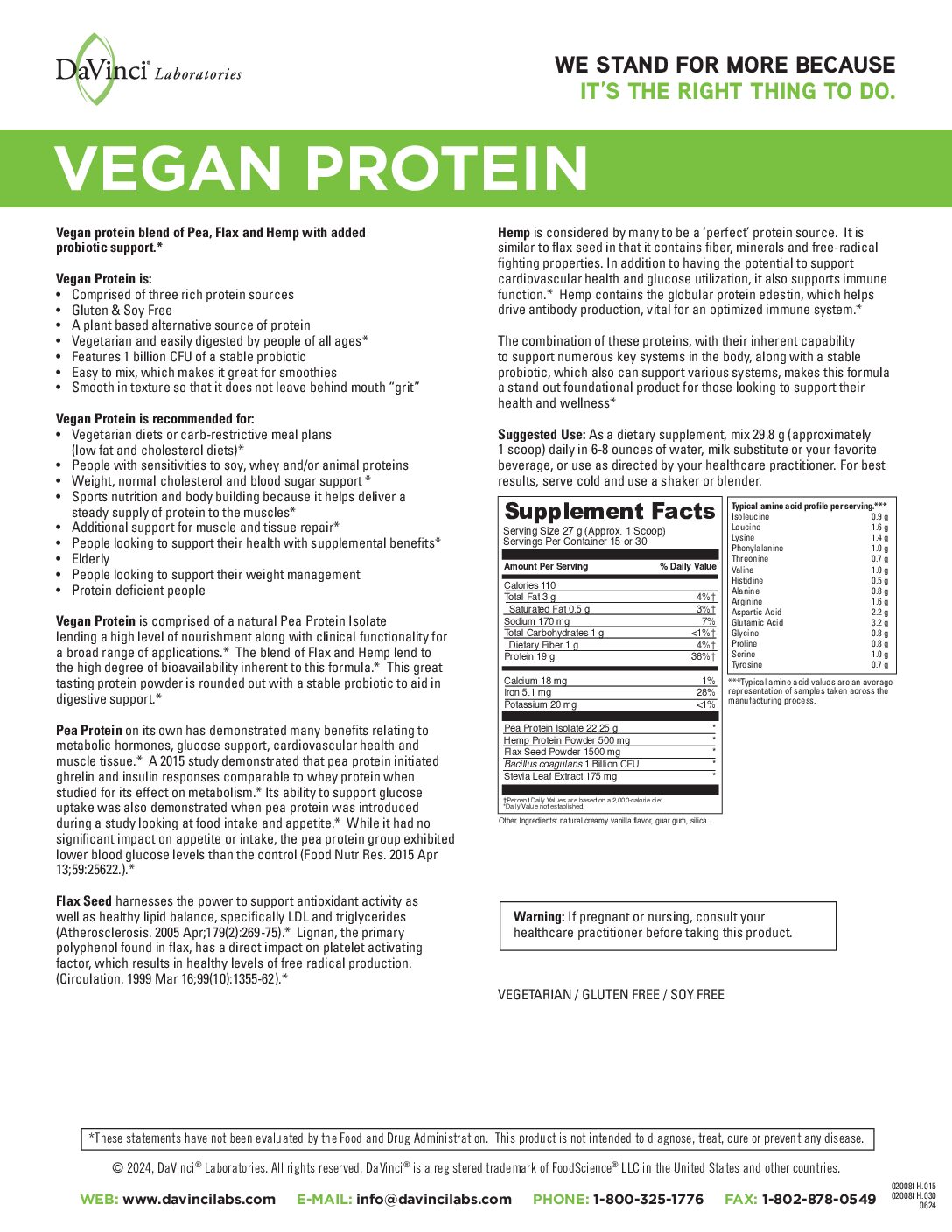 Vegan Protein – Vanilla is comprised of a natural Pea Protein Isolate lending a high level of nourishment along with clinical functionality for a broad range of applications. The blend of Flax and Hemp lend to the high degree of bioavailability inherent to this formula. This great tasting protein powder is rounded out with a stable probiotic to aid in digestive support.*