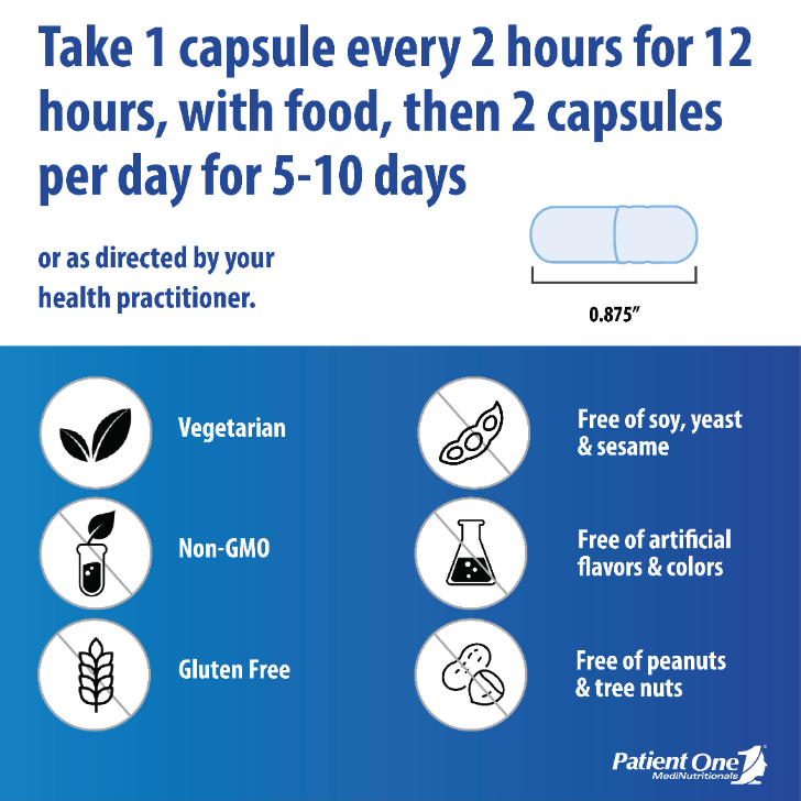 Made with ingredients that are free of: milk, egg, fish, peanuts, crustacean shellfish, soy, tree nuts, wheat, yeast, gluten, sesame Suggested UseLoading Dose: Take 1 capsule every 2 hours for 12 hours, preferably with food. Maintenance: Take 2 capsules per day for 5 or more days, or as directed by your health practitioner. Intended for short-term use (approximately 10 days), as needed. WarningsThis product is contraindicated if you are pregnant or nursing or have a known allergy to plants of the daisy family. If you are taking any medications, consult your health practitioner before use. Discontinue use and consult your health practitioner if any adverse reactions occur. Keep out of reach of children. Use only if safety seal is intact. and GMOs. |